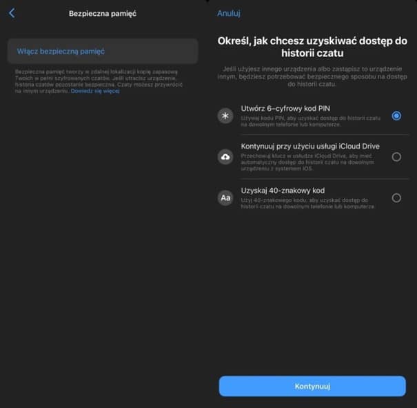 Jeśli chcesz odczytać zaszyfrowane wiadomości w aplikacji Messenger na innym urządzeniu, musisz włączyć bezpieczną pamięć (np. z poziomu swojego smartfona). By uzyskać dostęp do konwersacji na nowym urządzeniu, należy wprowadzić 6-cyfrowy kod PIN lub 40-znakowy kod, który zostanie ustalony na etapie włączania opcji bezpiecznej pamięci.
