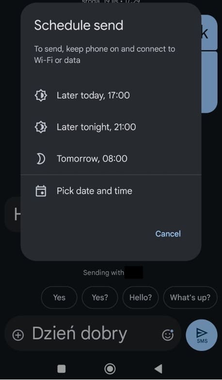 Tak, zaplanowany SMS zostanie wysłany, nawet jeśli smartfon nie jest połączony z internetem. By przesłanie wiadomości z opóźnieniem się powiodło, urządzenie musi być jednak połączone z siecią komórkową.
